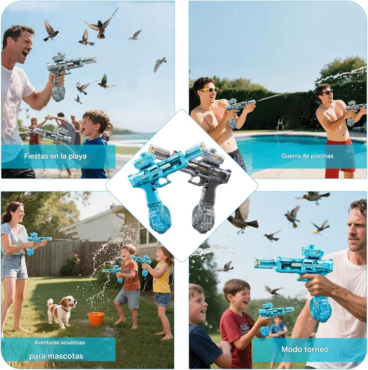 La Diversión comienza con cada disparo, potencia, luces RGB y un chorro de agua que hace que cada juego sea más emocionante, Perfecta para Niños, Jóvenes y adultos que aman la acción al aire libre.